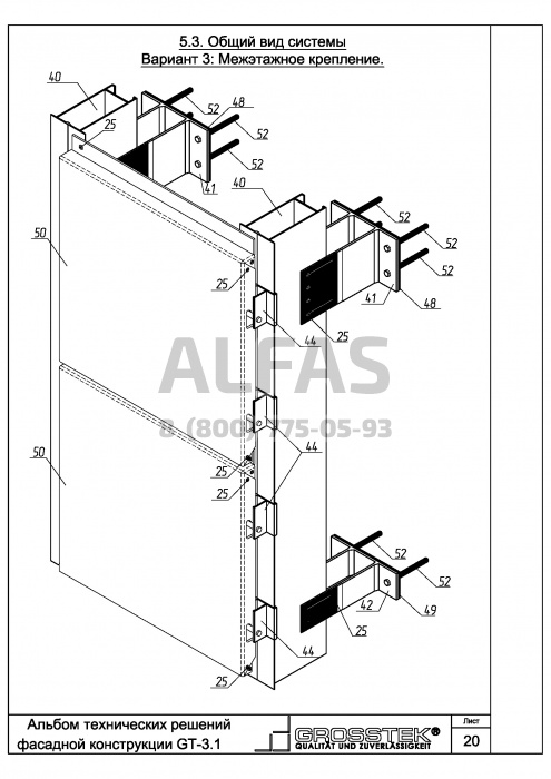 Все части фасадной системы Grosstek GT-3.1 изготавливают из алюминиевого сплава, что делает конструкцию легкой и прочной. Вследствие легкости конструкции, нагрузка на несущую стену ощутимо меньше, чем у систем из других материалов, притом, что сама система способна выдерживать большой вес облицовочного материала.
